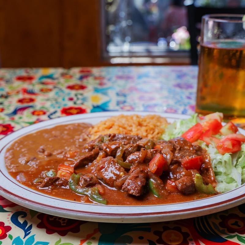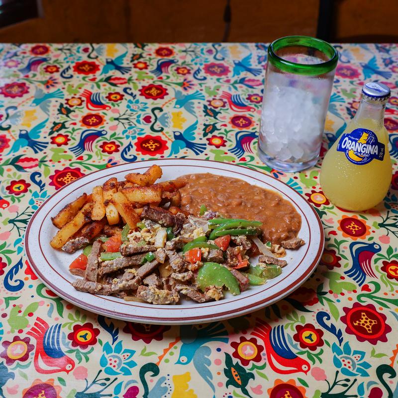 Tender pieces of chopped steak sautéed ranchero style with green chile, chile chipotle, bell pepper, onions, and tomato