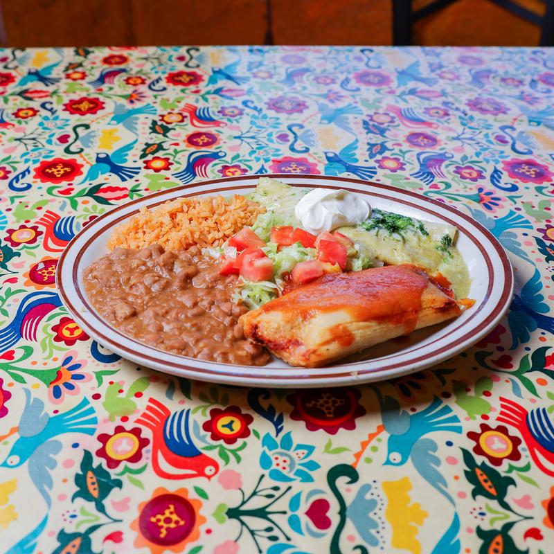 One Tamale (Rajas, Pork, or Chicken) with a choice of 1 of the following: Cheese Enchilada, Taco Dorado, or Quesadilla
