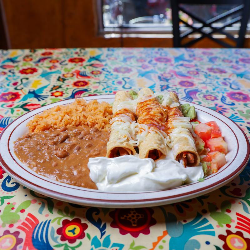 Regular $18.00 | Without Rice and Beans $14.00 • Three flautas topped with cheese, colorado sauce, sour cream, and fresh guacamole